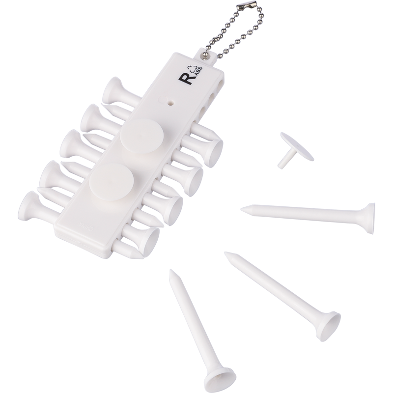 Recycled plastic golf tee set consisting of 12 tees in a compact holder with three ball markers with keychain. Includes the recycled plastic logo on the back. Available pad printed with your design on 1 side.