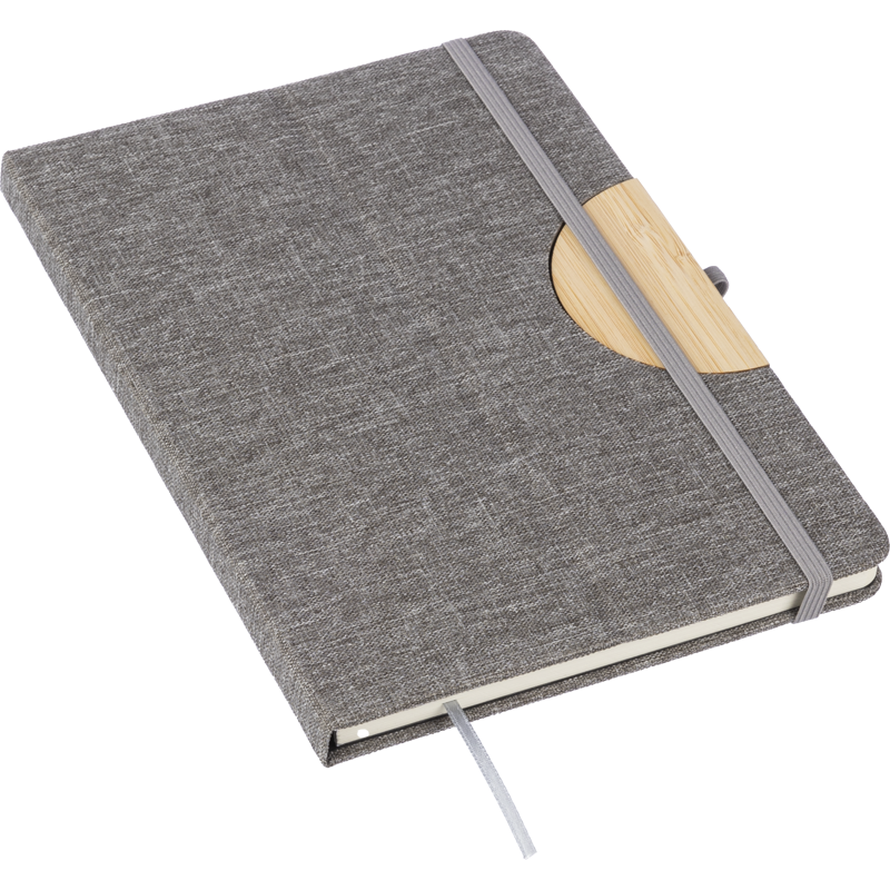 RPET 300D note book (approx. A5) a bamboo feature with 80 lined pages, featuring a pen loop. The foldable cover turns and can be used as a phone holder.