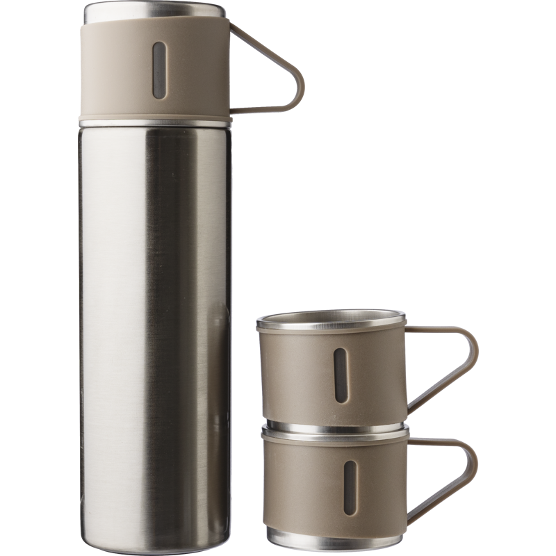 Stainless steel bottle and cup set, 420ml double-walled bottle with two 150ml cups, packaged together in a brown carton box. Not dishwasher safe.