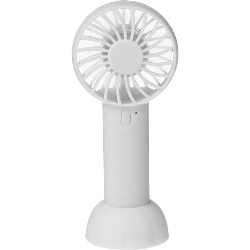 Rechargeable personal fan with 3 speeds and a Type-C charging port and cable. Includes a stand for upright positioning. Individually packaged in a brown cardboard box.
