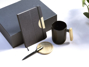The Laura gift set includes an A5 RPET hard cover notebook, a ballpoint pen, a ceramic mug, and a coaster. The notebook has a black elastic closure and a ribbon marker, and 80 lined cream-coloured sheets of 80 g/m² paper. The notebook cover together with the bamboo semicircle functions as a phone stand. The ballpoint pen is made of RCS certified recycled aluminium with a black spray coating, and bamboo accessories on both sides of the upper barrel. Pen ink: Black. Writing length: 400 metres. The 480 ml ceramic mug comes with a bamboo coaster. Handwash only. Mug size: 11 x 12.7 cm. Coaster diameter: 9.5 cm. Gift box size: 32 x 27 x 10.3 cm. FSC certified paper, FSC certified cardboard, Recycled Aluminium.