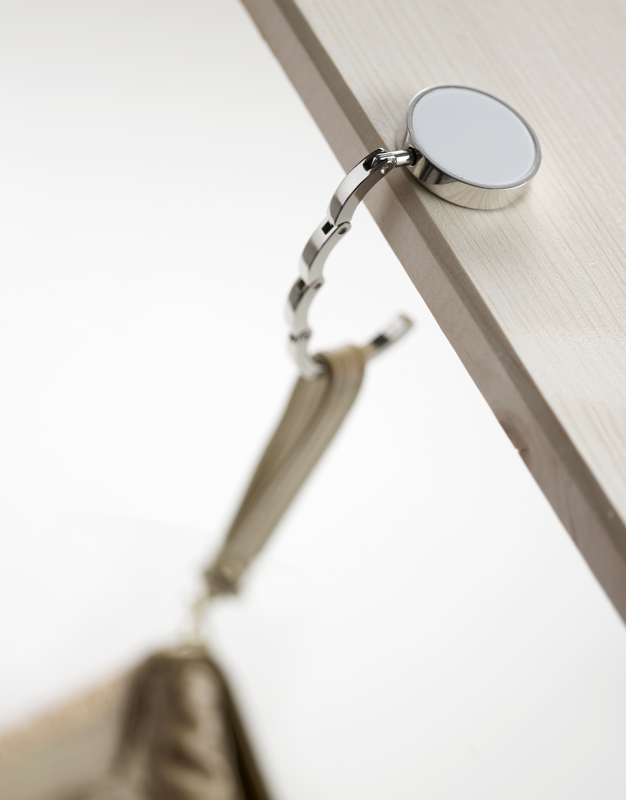 Foldable metal bag hook in a gift box. Available in Black or White.
