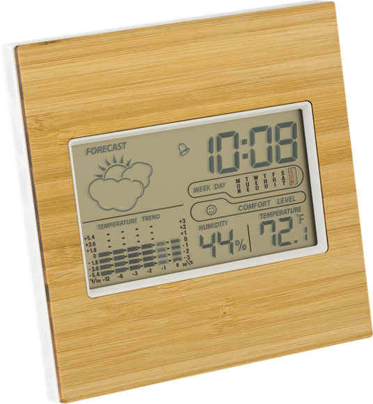 Bamboo and plastic weather station with foldable stand that locks into several different positions. Functions: time, calendar, week overview, alarm and snooze, temperature, humidity and weather information. Batteries included.
