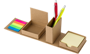 Cardboard cube with lid. Folds out to reveal small sticky notes in 5 different colours twenty five sheet each and 2 pockets with larger sticky notes with 80 sheets each. When open, the inside compartment can be used as a pen holder.