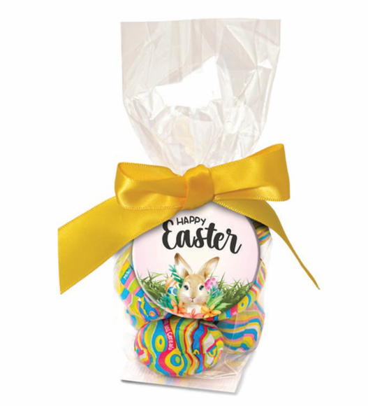 A delicious cream and crunch chocolate mix, tied with a bright yellow ribbon and an elegant egg-shaped tag.