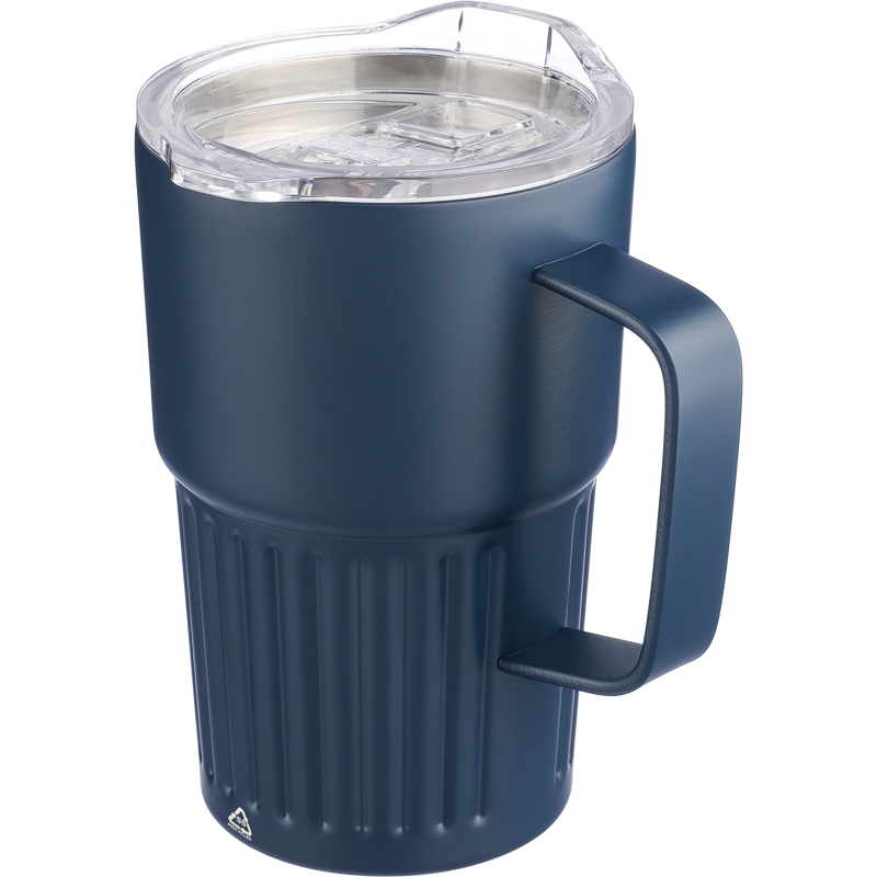 Recycled stainless steel double walled travel mug (450ml)Β with a slide closure lid. Includes an engraved recycled logo on the body. Individually packaged in a brown cardboard box.