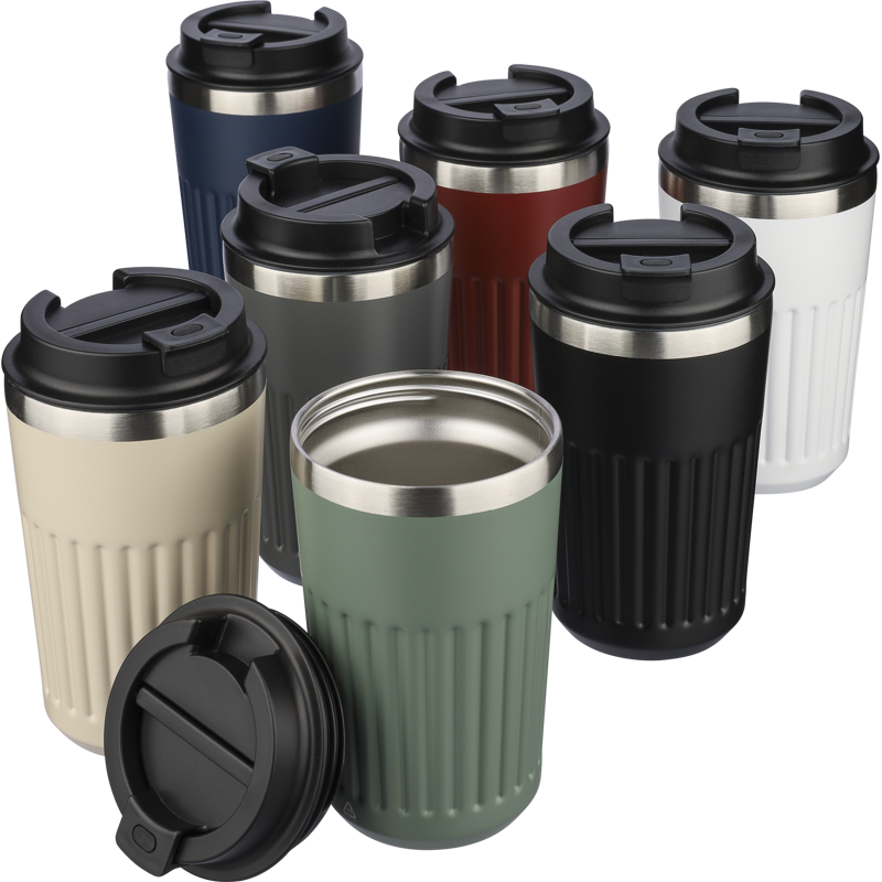 Recycled stainless steel travel mug (400 ml) with double wall and outer ridges. Engraved recycled logo on the body. Packed in brown box.