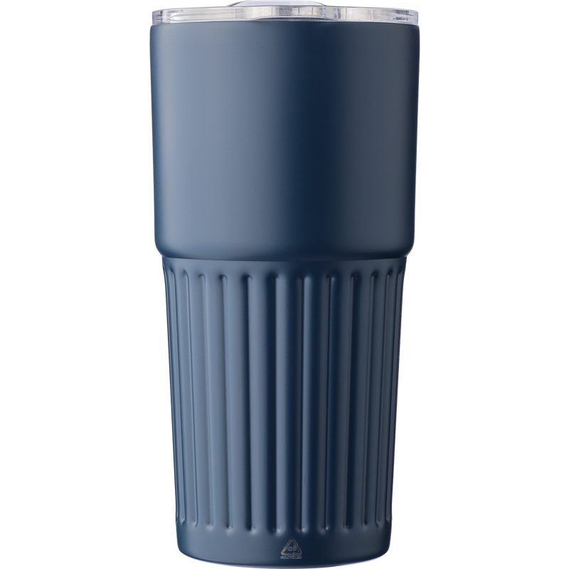 Recycled stainless steel double walled drinking mug (500ml) Includes an engraved recycled logo on the body. Individually packaged in a brown cardboard box.
