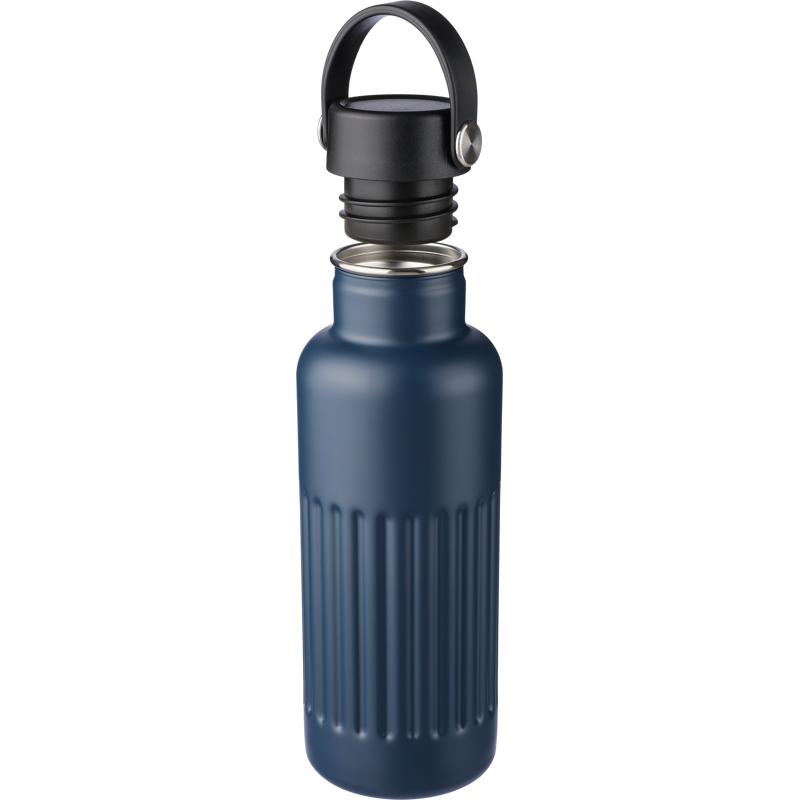 Recycled stainless steel double walled drinking bottle (500ml) Recycled stainless steel drinking bottle with a TPE handle for easy carrying. Includes an engraved recycled logo on the body. Individually packaged in a brown cardboard box.