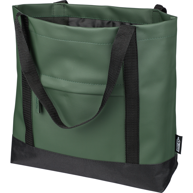 RPET (600D) polyester tote bag with PU coating on both sides for water repellency. Features a front zipped pocket, a small zipped pocket inside and long carrying handles. Designed with a 10-litre capacity and a 10 kg carrying capacity. Includes an rPET label. Available in a range of colours. Can be printed with your design in up to full colour.